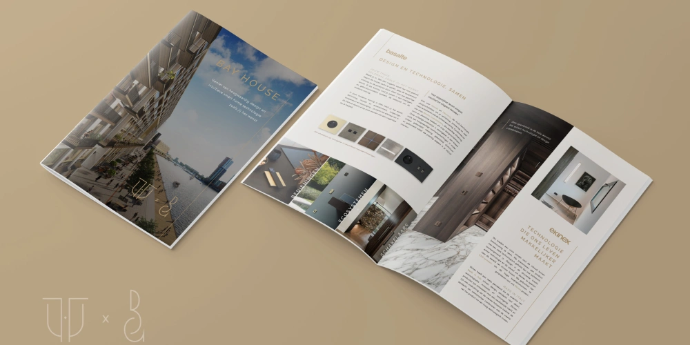 Voor B&G Domotica hebben wij deze luxe brochure mogen ontwikkelen voor het nieuwbouwproject Bay House Rotterdam. Om de brochures nog extra uitstraling te geven is deze afgewerkt met goudfolie. ✨