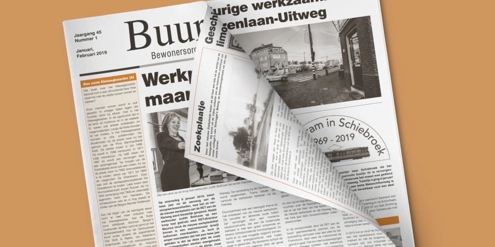 "Wat ik zo leuk vind aan de buurtkrant is dat ze altijd foto's uit de oude doos gebruiken voor het zoekplaatje" vertelt Maurice. Dit past helemaal in de look & feel van de krant omdat we gebruik maken van echte vintage kleuren. Hier gebruiken we Pantone 151C & Pantone Black 4C voor! Omdat de krant altijd in twee-kleuren wordt gedrukt is het bijna een feestje als de speciale editie uitkomt "deze drukken we dan in full color".