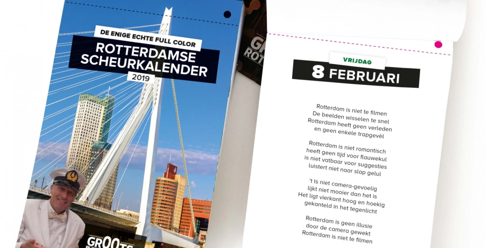 Dit jaar geven wij samen met Jack F. Kerklaan deze enige echte full color Rotterdamse scheurkalender uit en mogen we met trots de opmaak verzorgen. Het mooie is dat u speciaal voor uw bedrijf een gepersonaliseerde uitgave met uw eigen cover kan bestellen. Hoe leuk is dat?! Denk bijvoorbeeld alvast aan Sinterklaas, de kerstpakketten of de eindejaar geschenken.
