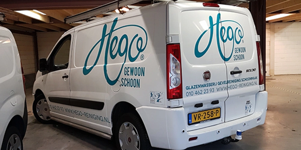 De gloednieuwe Fiat Scudo van Hego Reiniging is klaar om de weg op te gaan. Geheel voorzien van autobelettering in de huisstijl van Hego Reiniging is deze auto een rijdend reclamebord geworden. Wij wensen Hego Reiniging veel veilige kilometers!