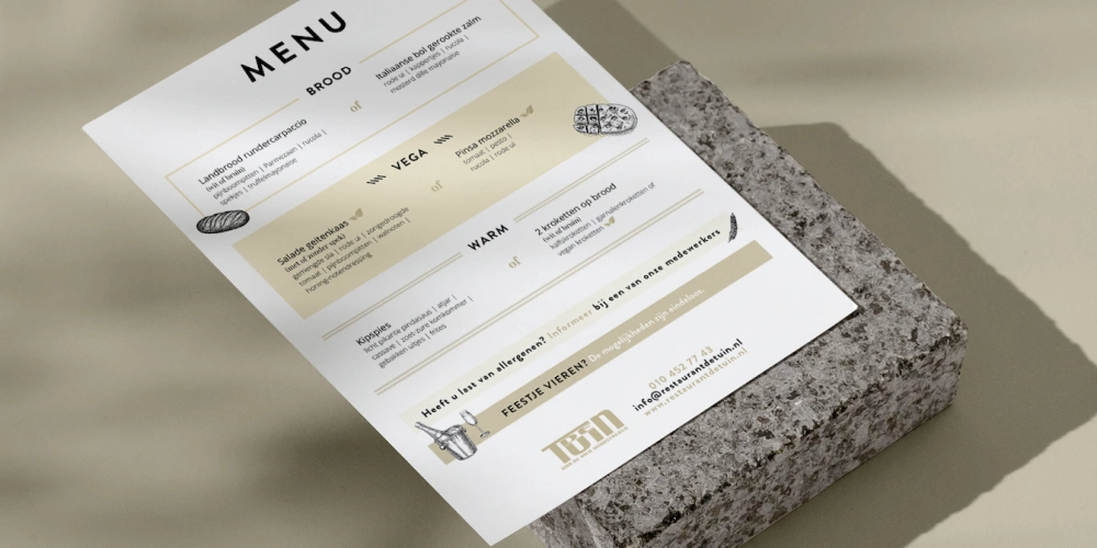 Restaurant De Tuin wilde graag hun blauwe menukaarten omzetten naar een mooie beige tint. Wij hebben het ontwerp en het drukwerk voor hen verzorgd! |